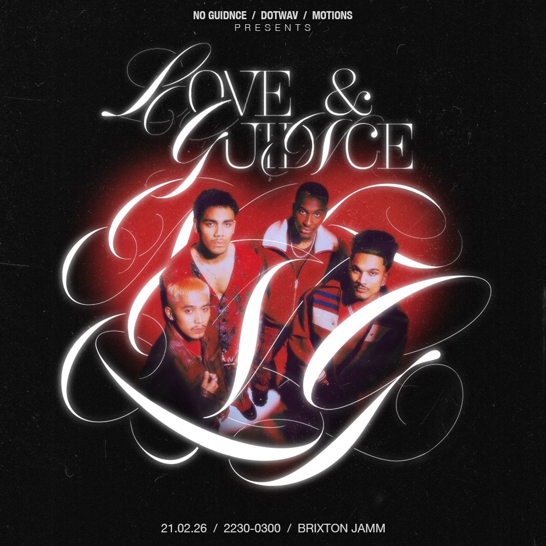 No Guidnce presents: Love & Guidnce Saturday 21 February 2026 22:30 Sunday 22 February 2026 03:00 Google Calendar ICS GET TICKETS NO GUIDNCE return to Brixton Jamm for 'Love & Guidnce'.Powered by DOTWAVENOTWAVE and IHEARTMOTIONS.Full lineup coming soon.